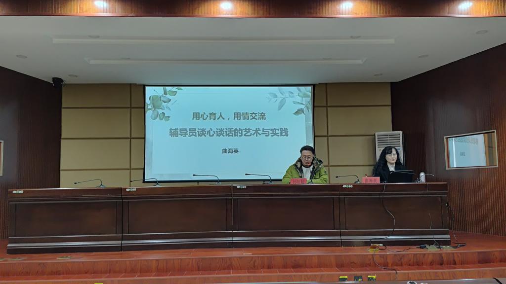 曲海英教授以《用心育人,用情交流——辅导员谈心谈话的艺术与实践》为题,围绕谈心谈话的意义、谈心谈话的基本原则、谈心谈话的流程与应用策略,结合身边的案例,给大家阐述了谈心谈话的艺术与实践。