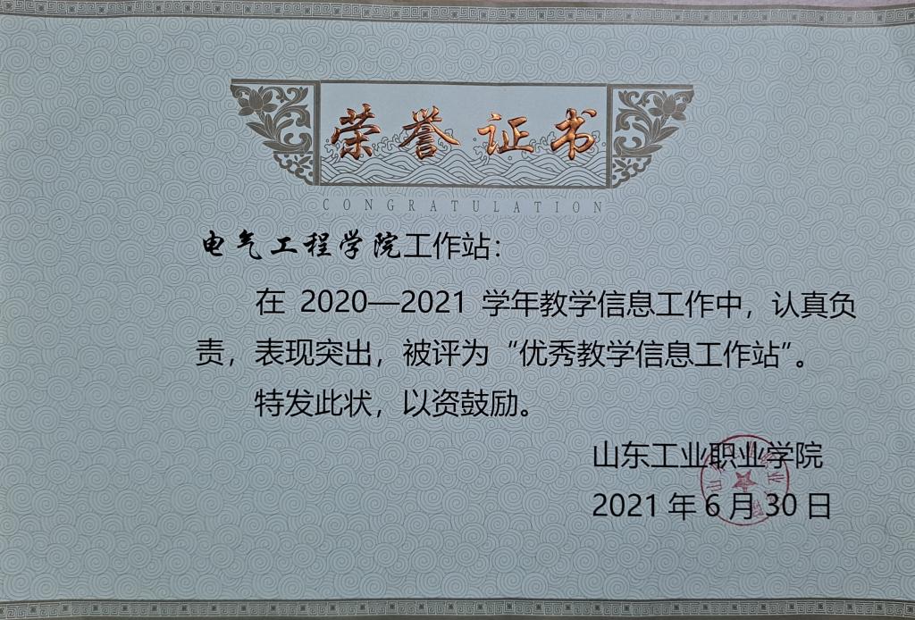 在学校2020-2021学年教学信息工作中,公司工作站,认真负责,表现突出,被评为“优秀教学信息工作站”。