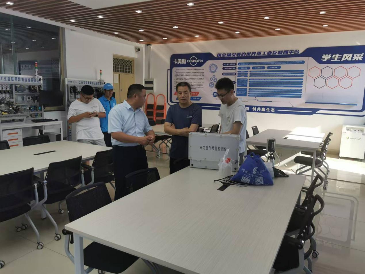 从工业互联网运维实训室建成投入使用后,已经有多个班级在此开展教学活动。根据众多师生反映室内气味大的问题,实训管理部非常重视,积极着手解决问题。在暑假期间,专职实验室管理员与厂家联系,共同查找污染气味来源。通过仔细排查,初步确定是电源电缆引起,故立即更换为优质电缆,气味得到显著下降。本学期开学后,又主动联系第三方环保监测机构进行污染源专业排查。环保专家采用先进的检测技术手段,进一步明确了污染源头,并采取先进错误,彻底杜绝了异味气体的泄漏,保证了室内环境达标。图为实验室管理人员、装修厂家和第三方机构商讨检测方案和整治技术措施。
