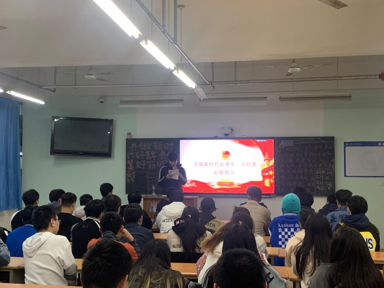 各班团支书向同学们讲述了做新时代好青年的重要性,新时代的大旗早已传入同学们手中,中华民族伟大复兴的中国梦也将在一代代青年的接力中成为现实。团支书呼吁同学们,作为新时代的新青年,应担当起时代赋予的重任,为了祖国更好的明天努力拼搏奋斗。