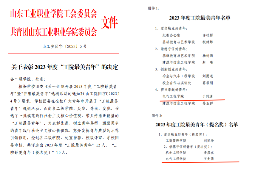 近日,学校团委下发了《关于表彰2023年度“工院最美青年”的决定》,公司员工于同潇获得“担当奉献好青年”、王龙强获得“崇德守信好青年(提名奖)”称号。