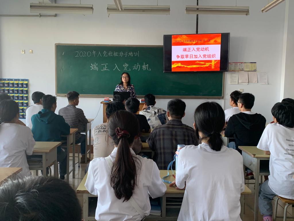 9月16日,党支部书记杨威老师以《党员的条件、权利和义务》为主题给同学们讲解党的历史和一些党章制度,并向同学们讲述党的规章制度。9月17日,由公司辅导员潘灿灿老师科技楼717以《端正入党动机》为主题,为同学讲解党员的责任跟义务,并要求同学们端正入党动机。9月23日,由公司辅导员于晨晨老师以《爱国就在我身边为主题》,同学们讲解爱国主义的含义,并要求新青年无时无刻心系祖国。10月22日,党支部书记杨威老师给同学们讲解入党要求,并对这次入党积极培训进行总结。
