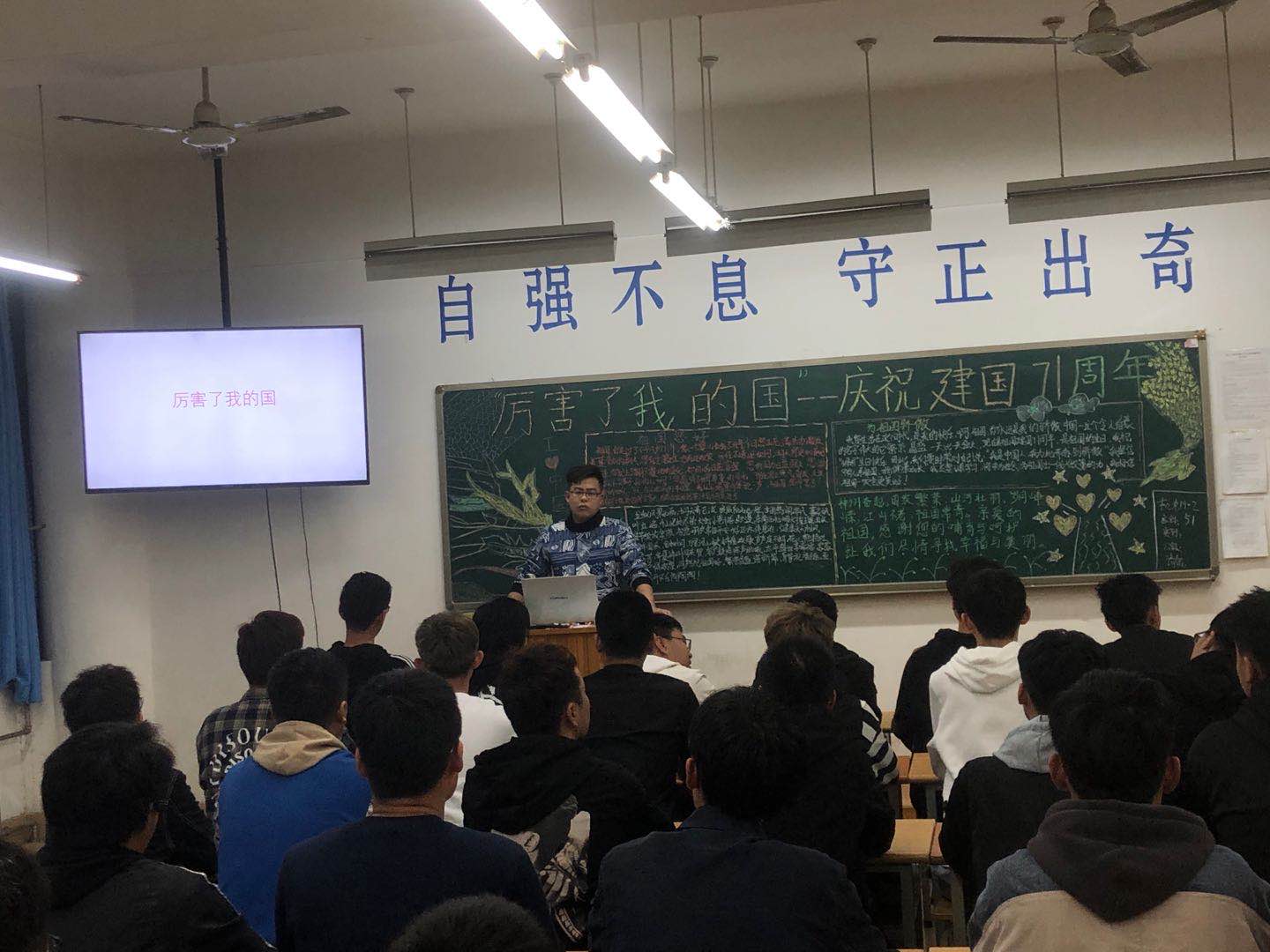 团课上,各班团支书向同学们讲解了我国从建国至今,71周年的辉煌建设之路。介绍了在创新、协调、绿色、开放和共享的新发展理念下中国的伟大成就,展现了中国人民在全面建设小康征程的伟大奋斗,彰显了以党中央的正确领导。为实现中华民族伟凝聚起全党全国人民的磅礴力量,为实现中华民族伟大复兴的中国梦不断前进。