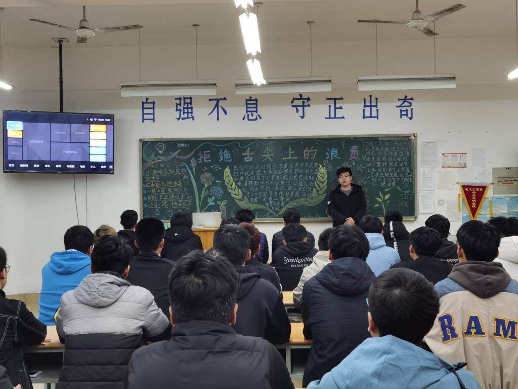 本次团课活动中团支书向同学们讲述了中共中央总书记,国家主席,中央军委主席习近平近日对制止浪费行为做出的重要指示。他强调坚决制止餐饮浪费行为,切实培养节约习惯;他指出,餐饮浪费现象,触目惊心、令人痛心!中国是一个崇尚艰苦奋斗、勤俭节约的民族,勤俭节约是中华民族的传统美德。在从站起来到富起来再到强起来的路上,我们要坚持尚俭戒奢,保持优良传统,做好“加俭乘除”制止餐饮浪费。