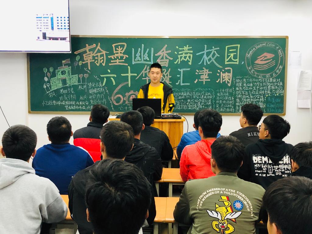 六十年春华秋实,六十年风雨兼程。为展现山工院人笃实、求真、明理、出新的精神,歌颂学院六十年取得的辉煌成就,5月21日晚自习时间,我系员工会组织部组织各班开展了以“翰墨幽香满校园,六十华诞汇津澜”的主题团课。